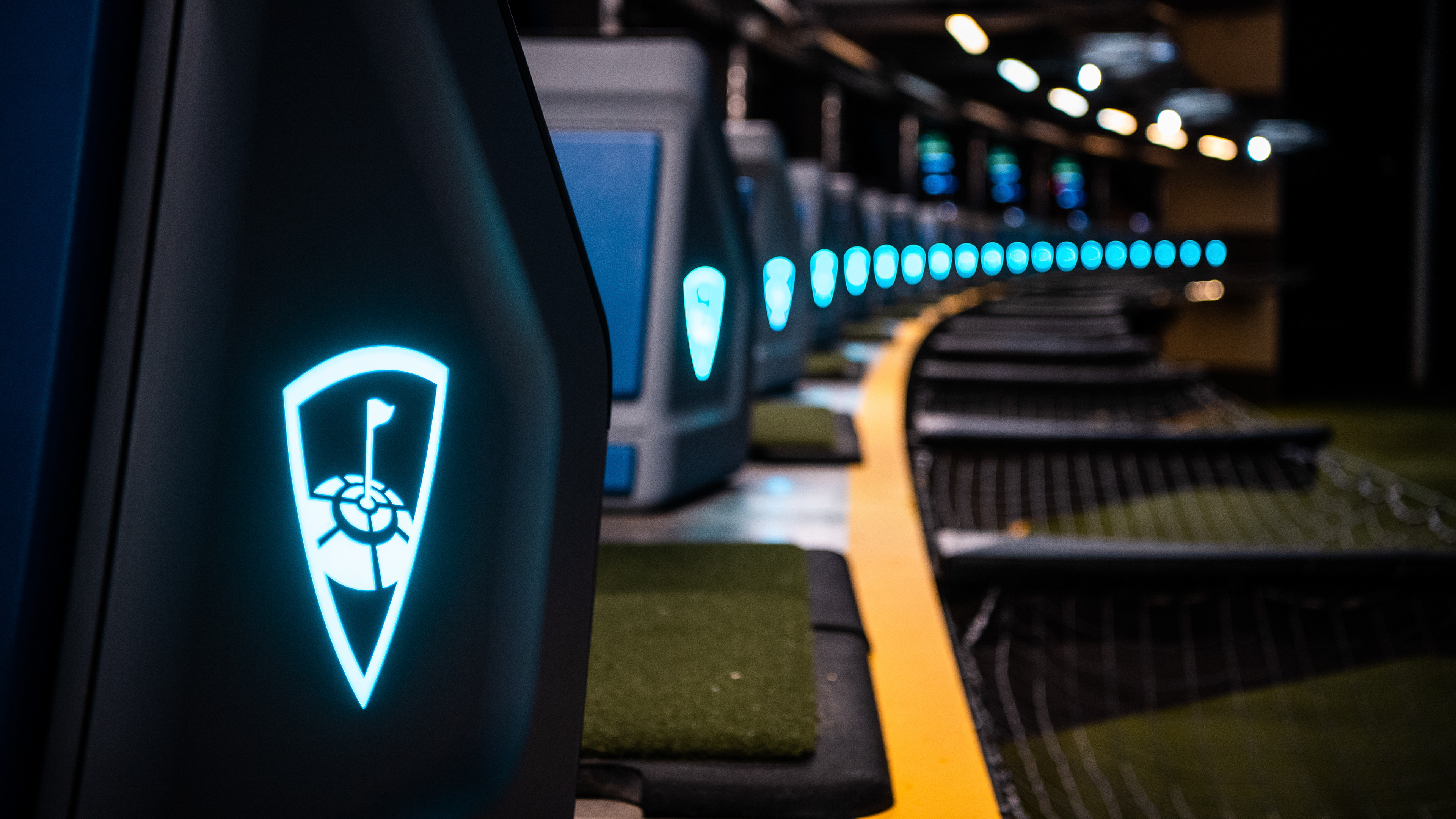 An embedded large screen provides a live visualization of Topgolf's proprietary ball-tracking technology, Toptracer
